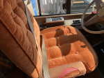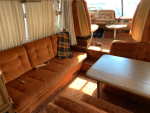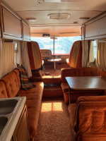 Original upholstery and carpet are in unbelievable, immaculate condition. Shag carpet kept covered all these years with throw rugs and it is gorgeous, clean, and bright. Central working vacuum, beautiful original 2-way fridge works and looks great, very clean. Extremely rare original locking ammo cabinet. Cool sofa/bunk is fully operational. Rear sofas currently configured as a bed, upholstery underneath is original and in beautiful condition.