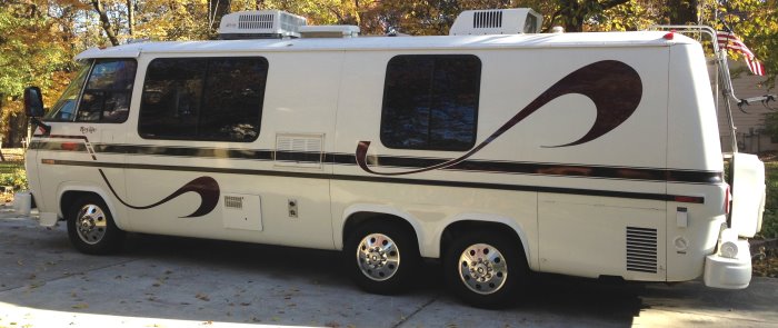 He added exterior modifications: visor, air dam, bumper wraps, head and tail light upgrades, entire coach (original white) was stripped and redone custom in 2007. He also started the interior upgrades with flex steel captains and rear beds, granite counter on kitchen and removed the oven/stove (we cook outside mostly with grill and electric skillet). Replaced toilet with new.