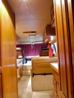 We laughingly call the coach "the Ralph Lauren Edition" since everything you see or touch on the inside is either natural leather or real walnut. The ceiling, wall panels and the full room darkening roman shades covering all the windows are beautiful caramel color natural leather as are all the seating surfaces. The custom flat dash features VDO instruments and burgundy color rolled pleather to match the burgundy color leather driver and passenger power seats and the pull around drapes that both cover the front windows and close off the cockpit area if you wish. This is a 1978 only floor plan featuring a large rear "U" shaped lounge that quickly and easily makes into a larger than king size bed for superb sleeping comfort by night and a great hang out or socialization space by day.